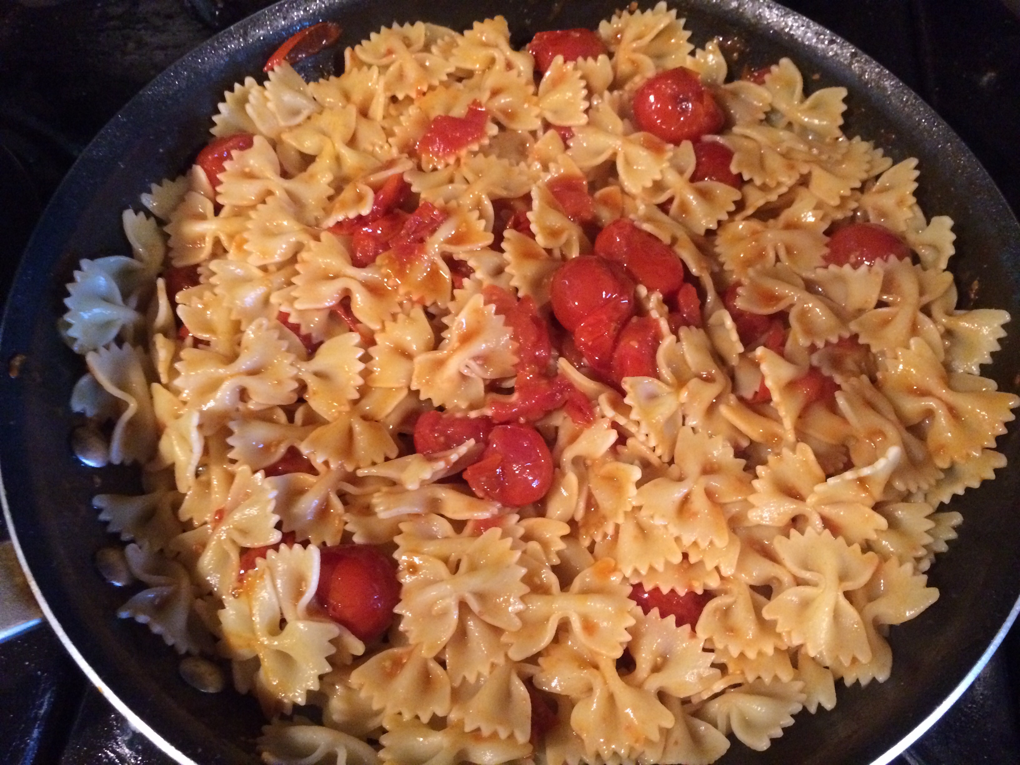 Cook tomatoes on medium high heat for 2-4 minutes, mashing half with a potato masher or spoon to release juices. When pasta is finished cooking, drain water and toss with tomatoes immediately. Cool to room temperature.