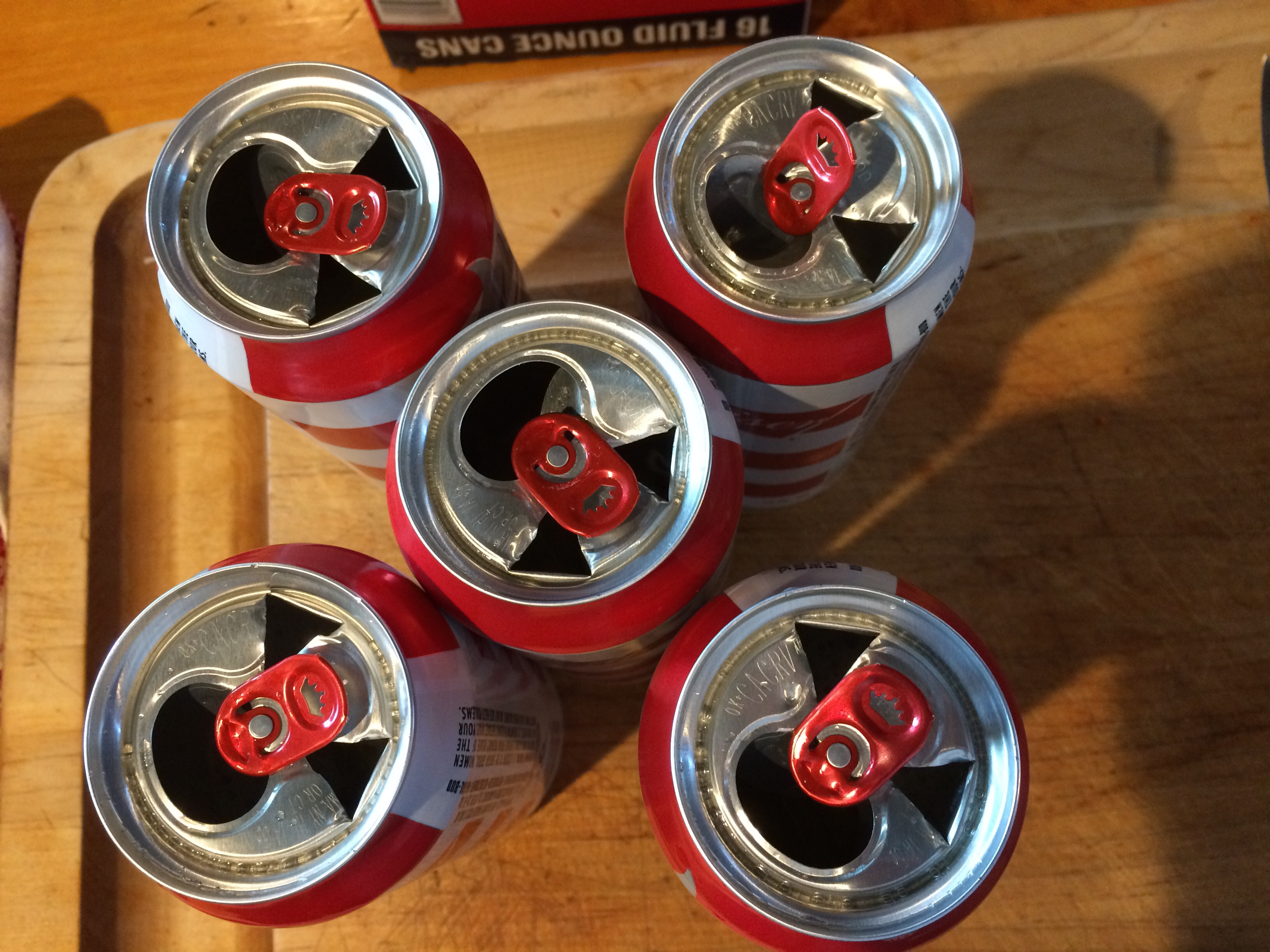 Open the can of beer (I typically use Budweiser) and drink half, after all, you’re the one doing all the work! I have used 12 and 16 ounce cans and they both work well. With a church key style can opener, make two extra holes in the top of the can. This will allow the maximum amount of steam to escape from the can while the chicken is cooking. Crumble the bay leaf and put it in the can with the remaining beer.