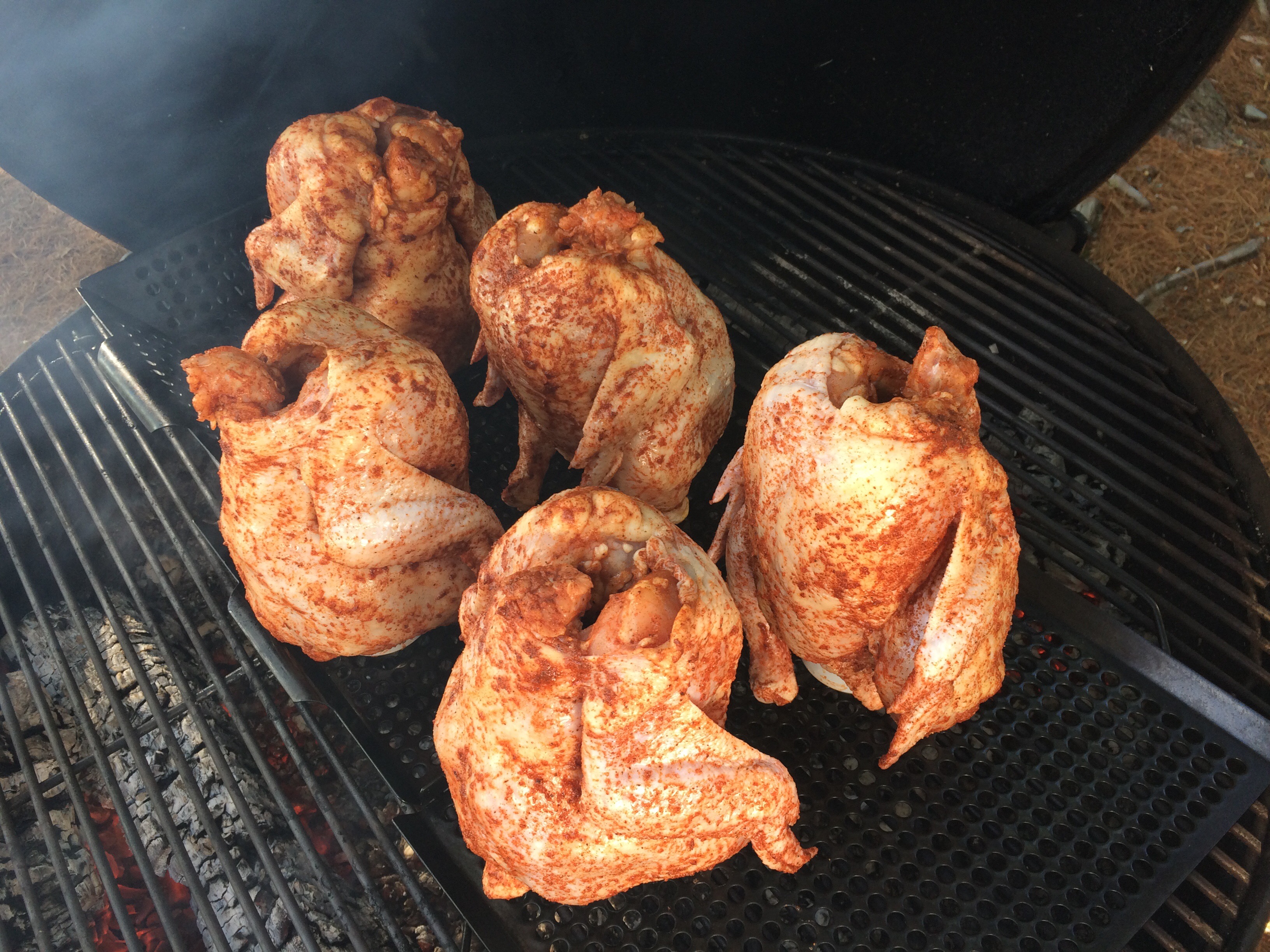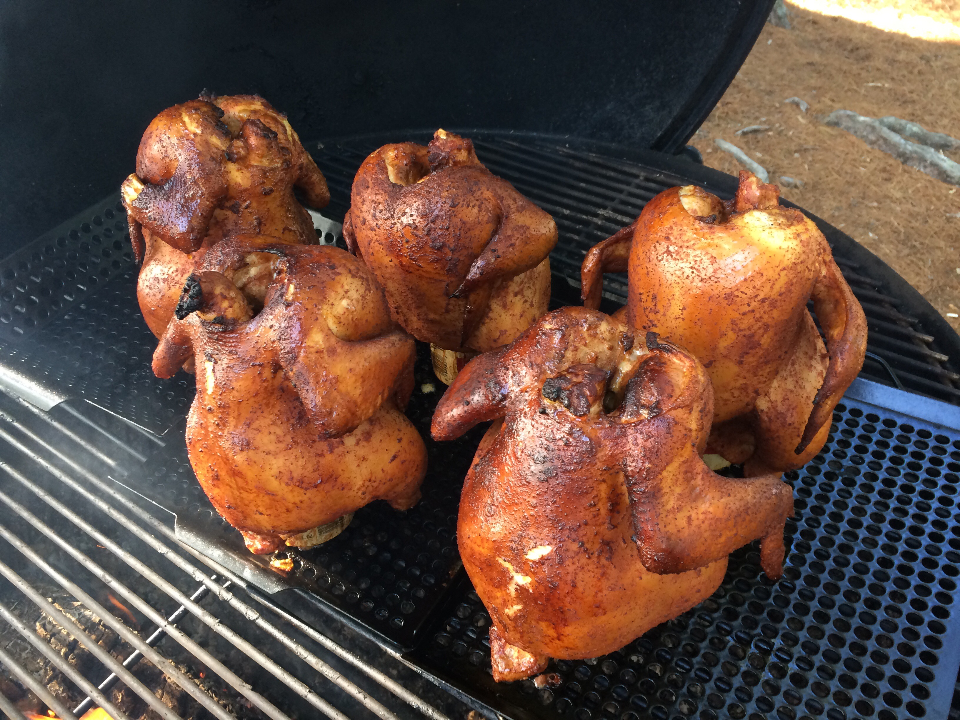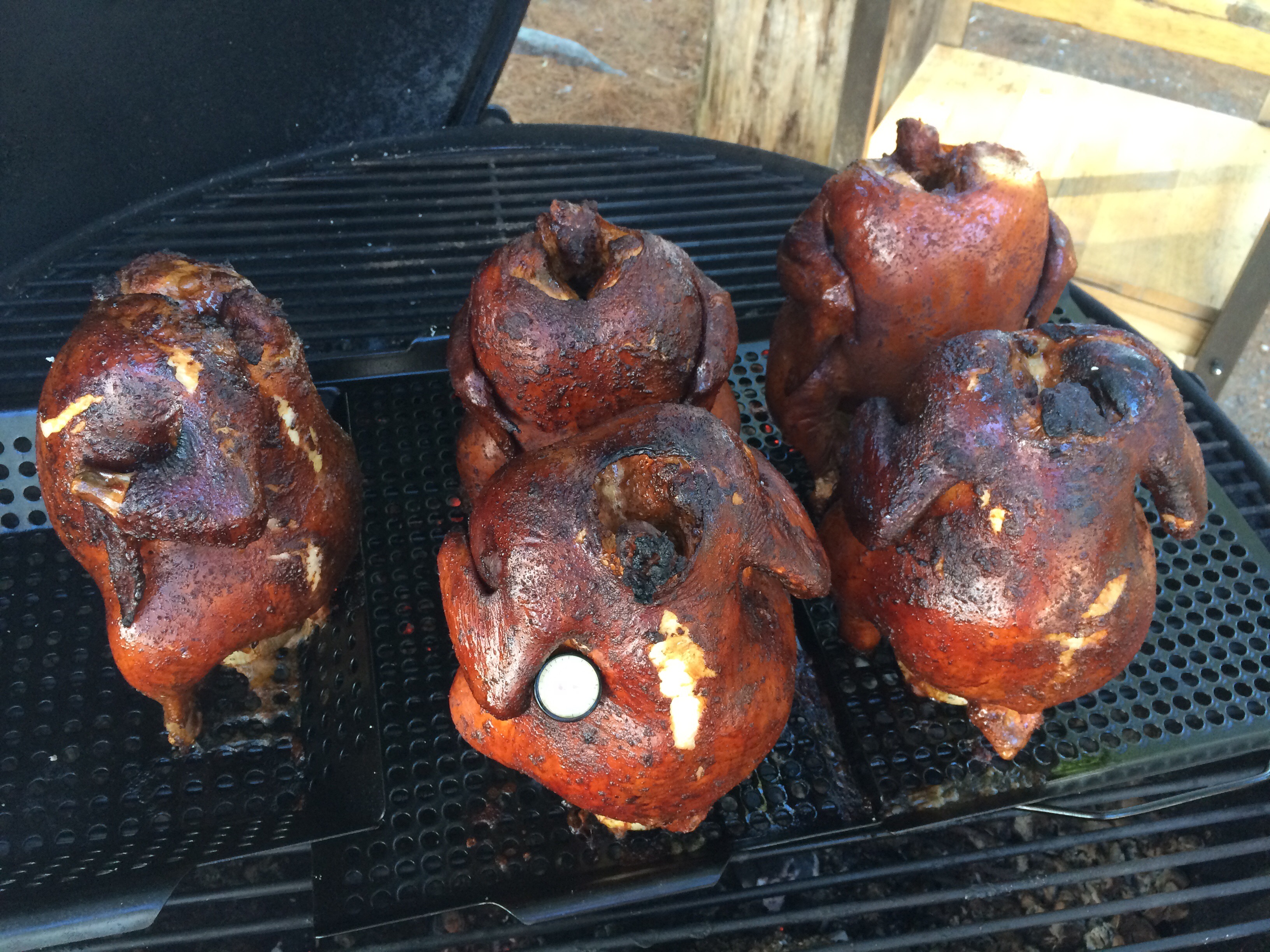 After the first hour, open the lid and take a look. Cooking over a live fire is not an exact science. There are many different variables that can affect cooking time. If all goes well, your chickens should look like this after an hour. A few times I have opened the grill only to be horrified at finding black, carbon-coated chickens inside. Every time I was pleasantly surprised to find that the chicken was still cooked perfectly inside and completely delicious!