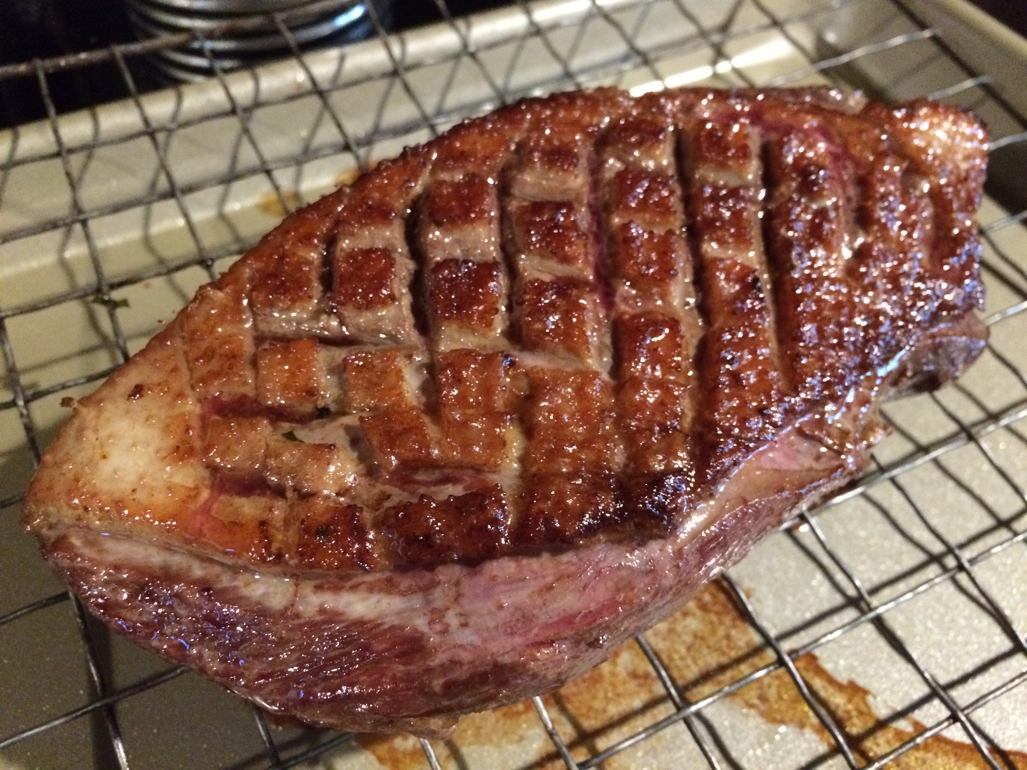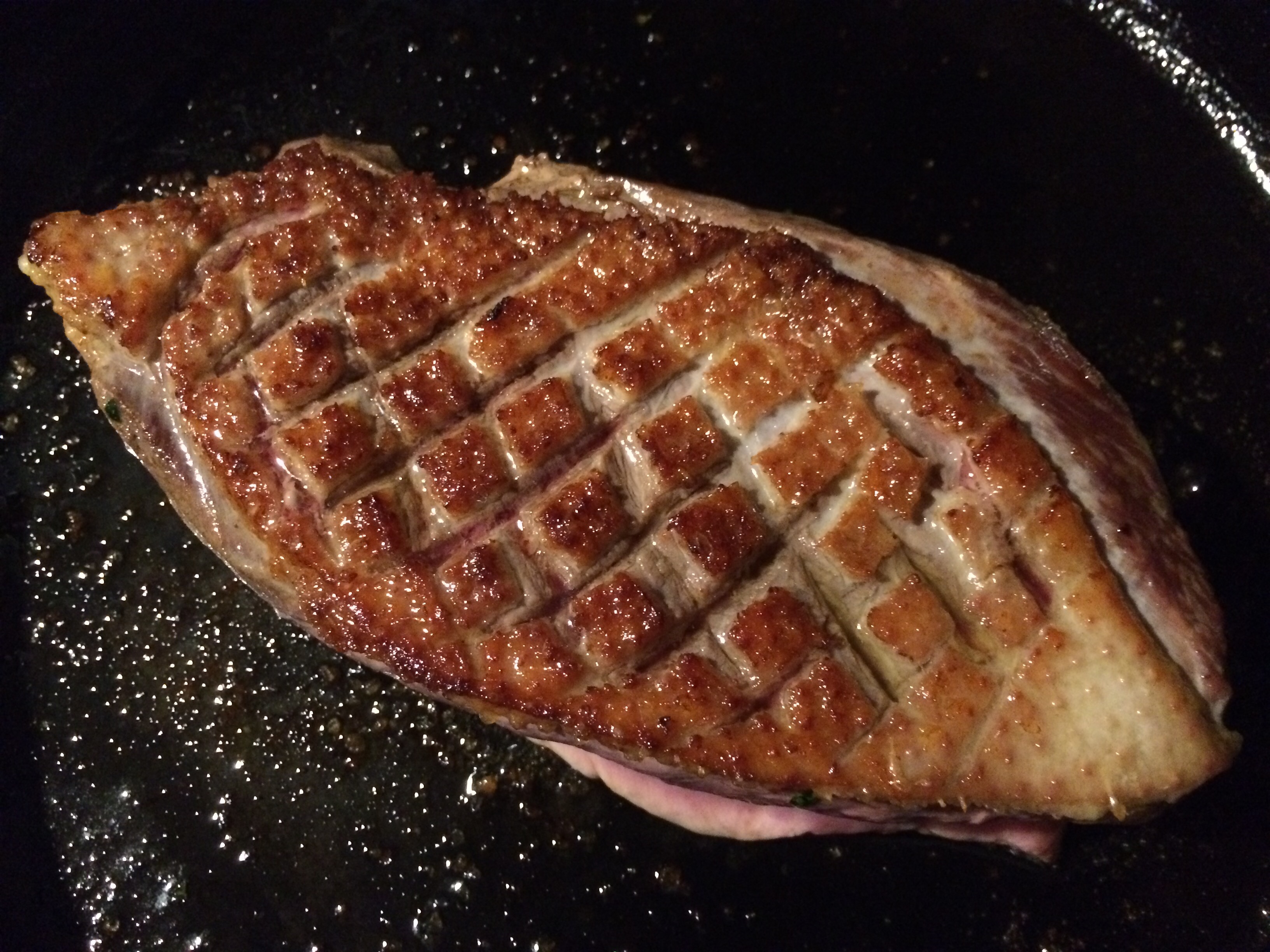 Heat a pan on the stove over medium heat and preheat the oven to 350 F. Using a very sharp knife, cut through the skin of the duck, first one way, then the other to make a diamond pattern. Be careful not to cut into the flesh.