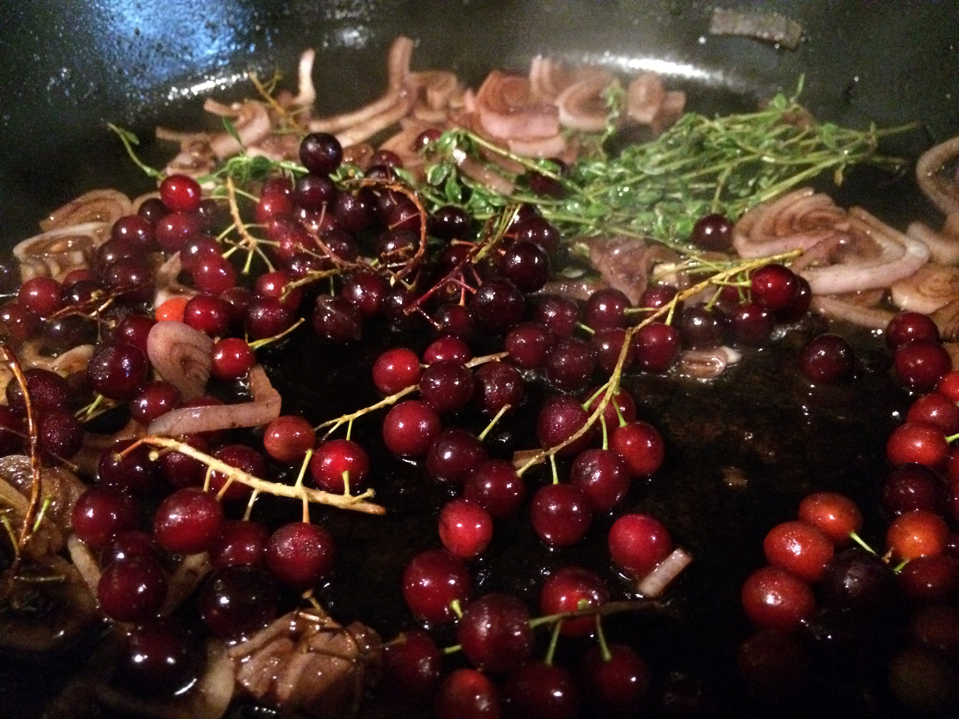 While the duck is resting, turn the heat back on your pan, pour off any excess fat and add all remaining ingredients except the butter to the pan. Bring to a boil, lower heat and reduce, mashing up currants to help them release their juices, until almost all the liquid has evaporated.