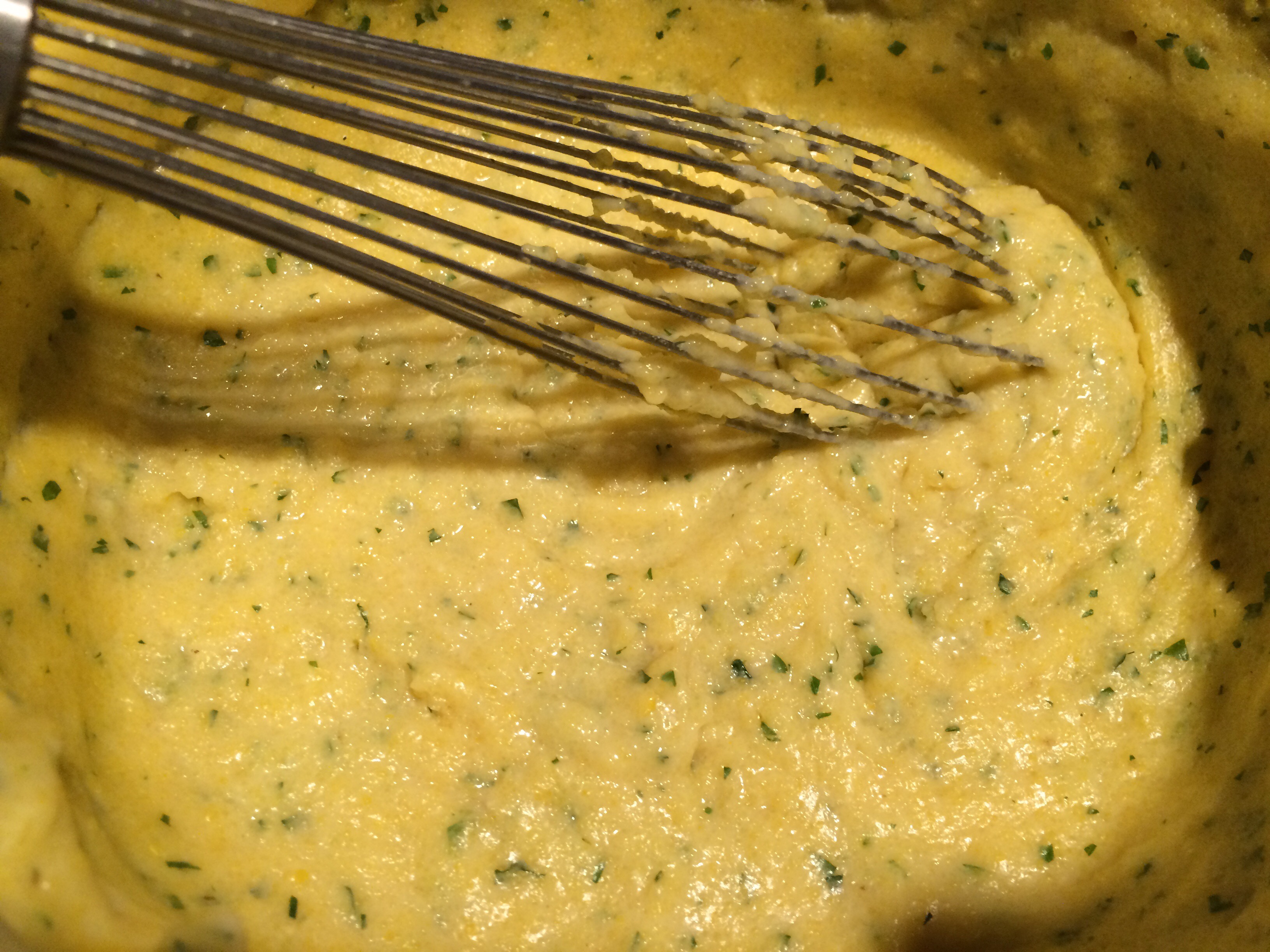 When ready to serve, add remaining ingredients and heat on medium low while stirring. You may need to add additional liquid to thin if it becomes too thick. You can use chicken stock, milk or water. Polenta should be the consistency of porridge. Taste and season with salt if necessary.