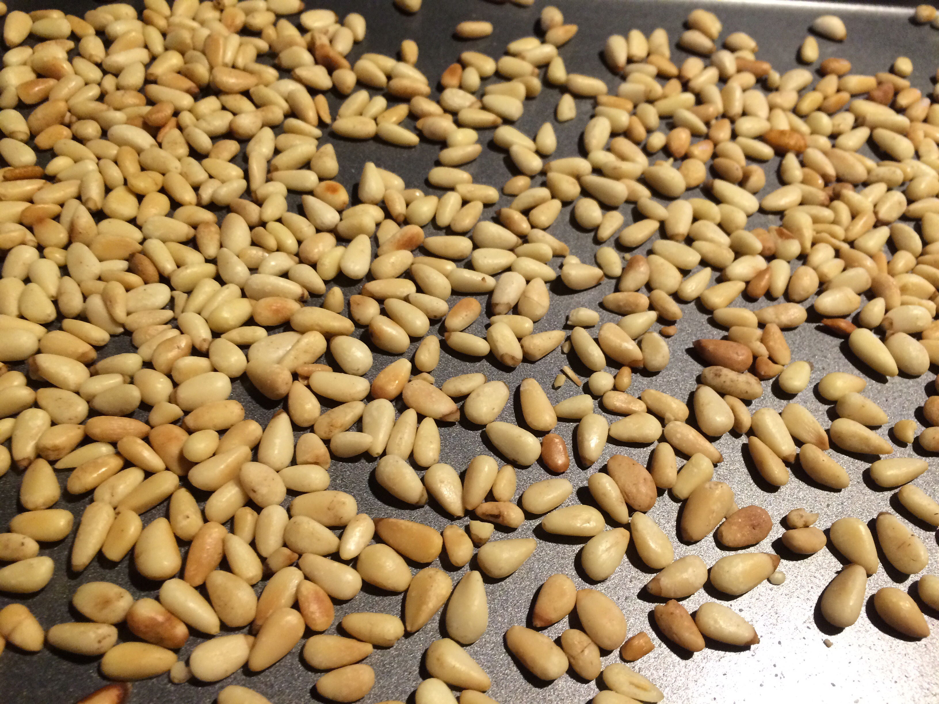 Toast pine nuts in a 350 F oven for 4-5 minutes. Cool on pan until ready to use.