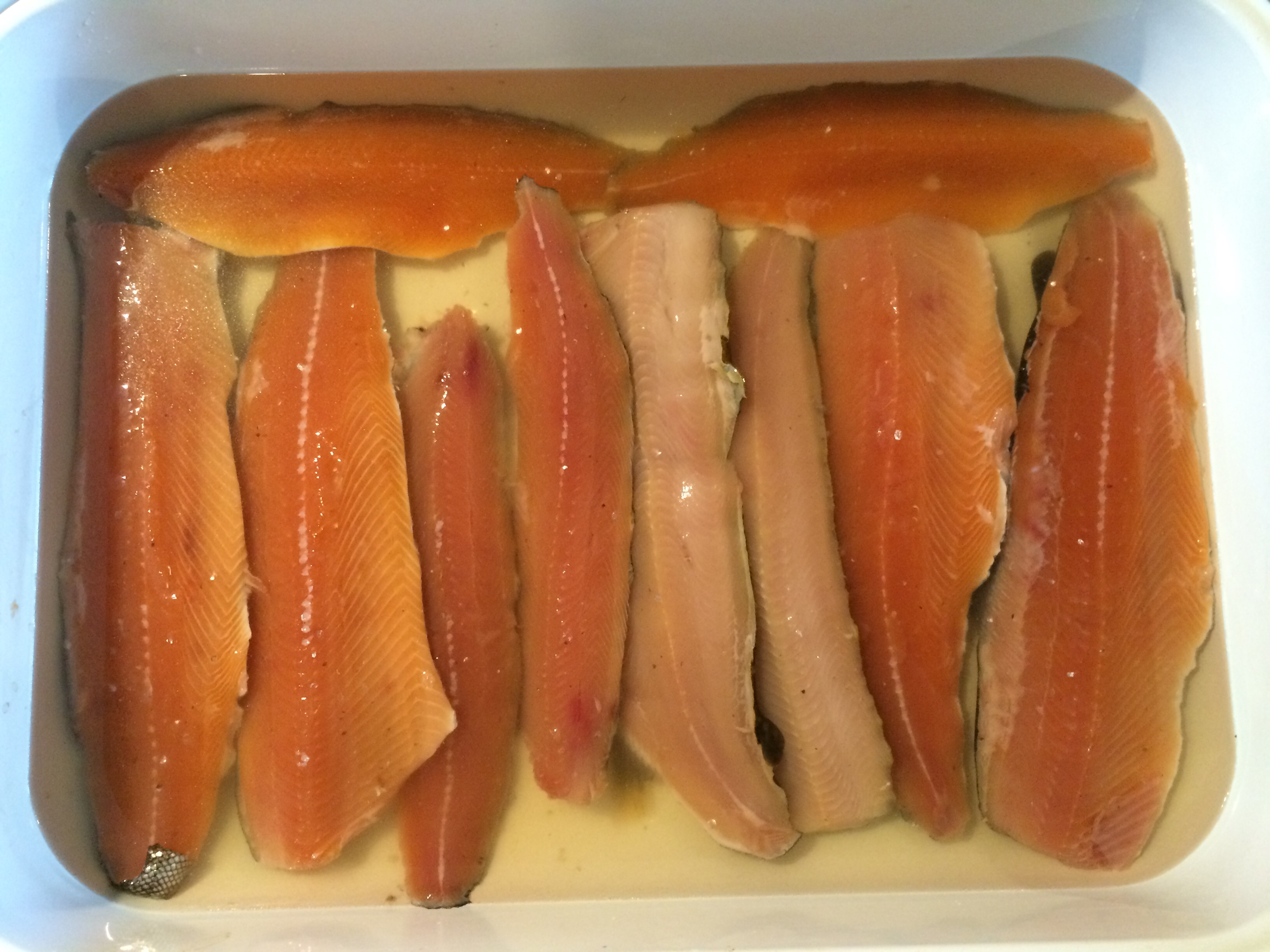Lay out your fillets side by side in a roasting pan or other shallow container. Completely submerse them in brine and allow to sit for one hour at room temperature, or longer if your fillets are particularly thick.