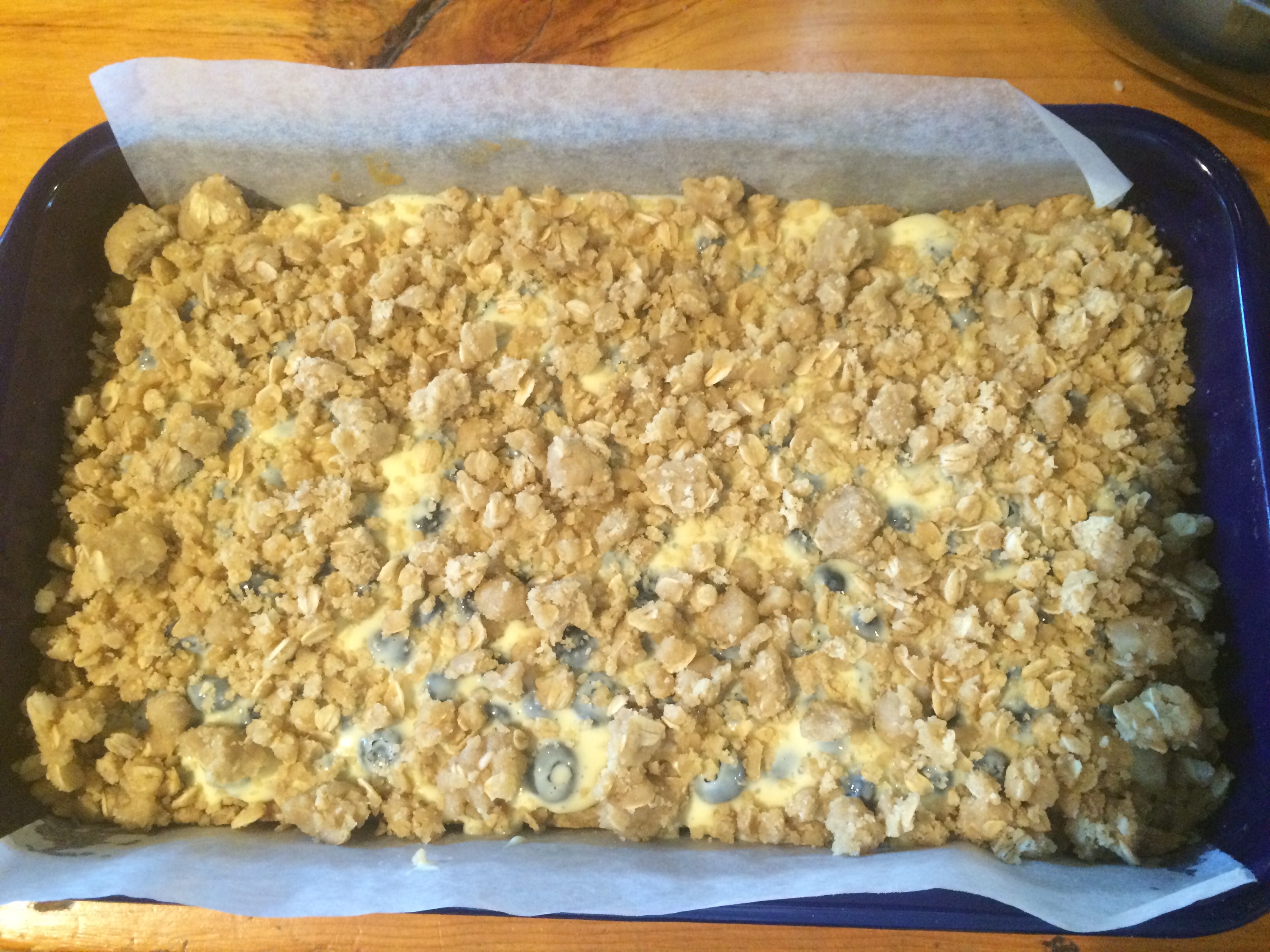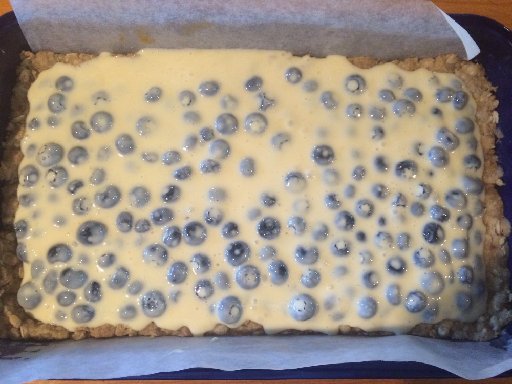 Meanwhile, combine the egg, egg yolk, lemon zest, lemon juice, flour and sweetened condensed milk until smooth (I find that if you whisk together the egg and lemon zest and juice first the filling is most uniform. I have ended up with yellow flecks of egg yolk visible when I have just dumped everything in and then mixed it together). Stir in the blueberries. Spread the fruit filling over the crust.