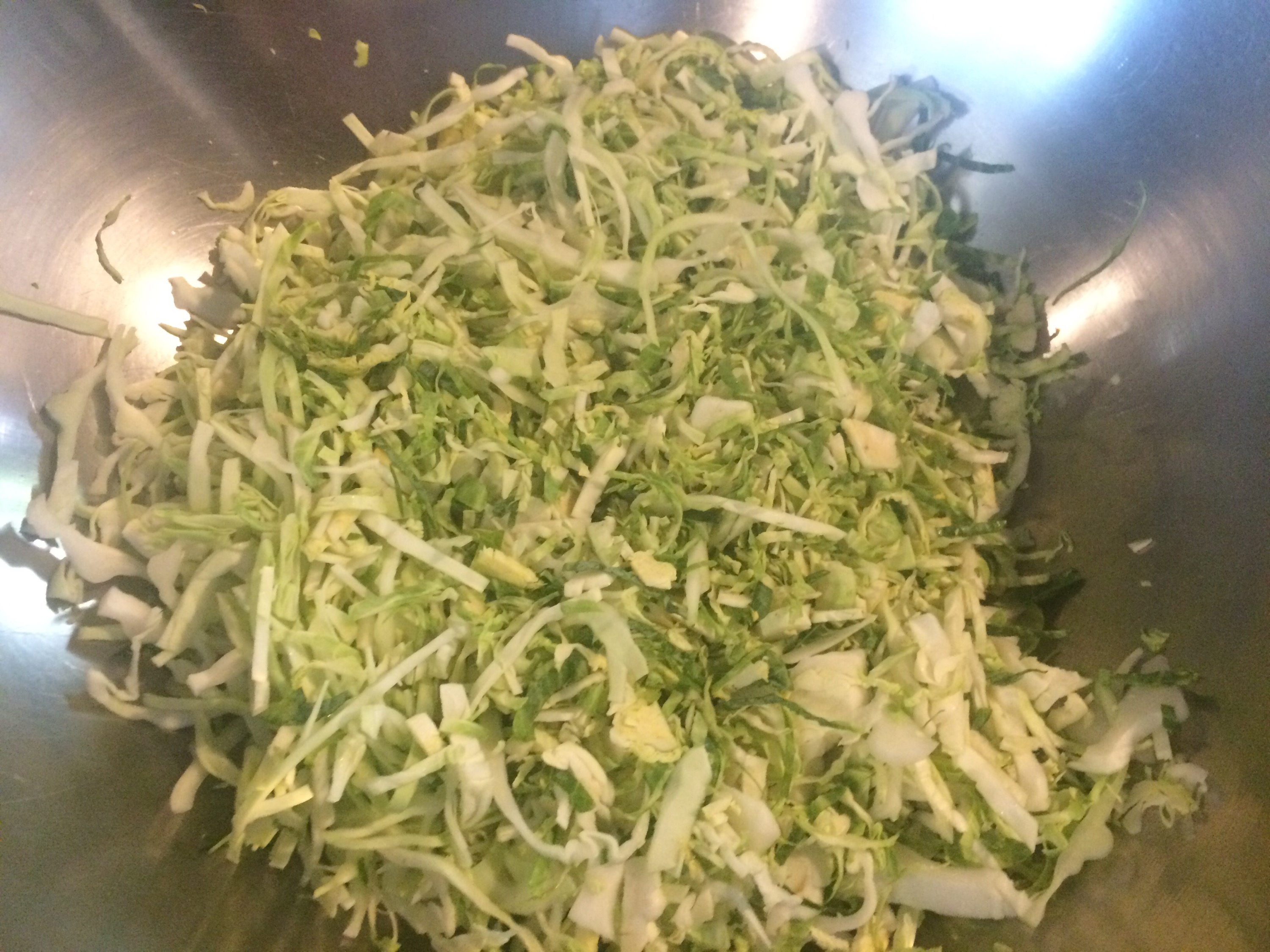 Cut Brussels sprouts in half and slice thin, discarding the core end. Quarter cabbage and cut out core. Slice thin and combine with Brussels sprouts in a large bowl.