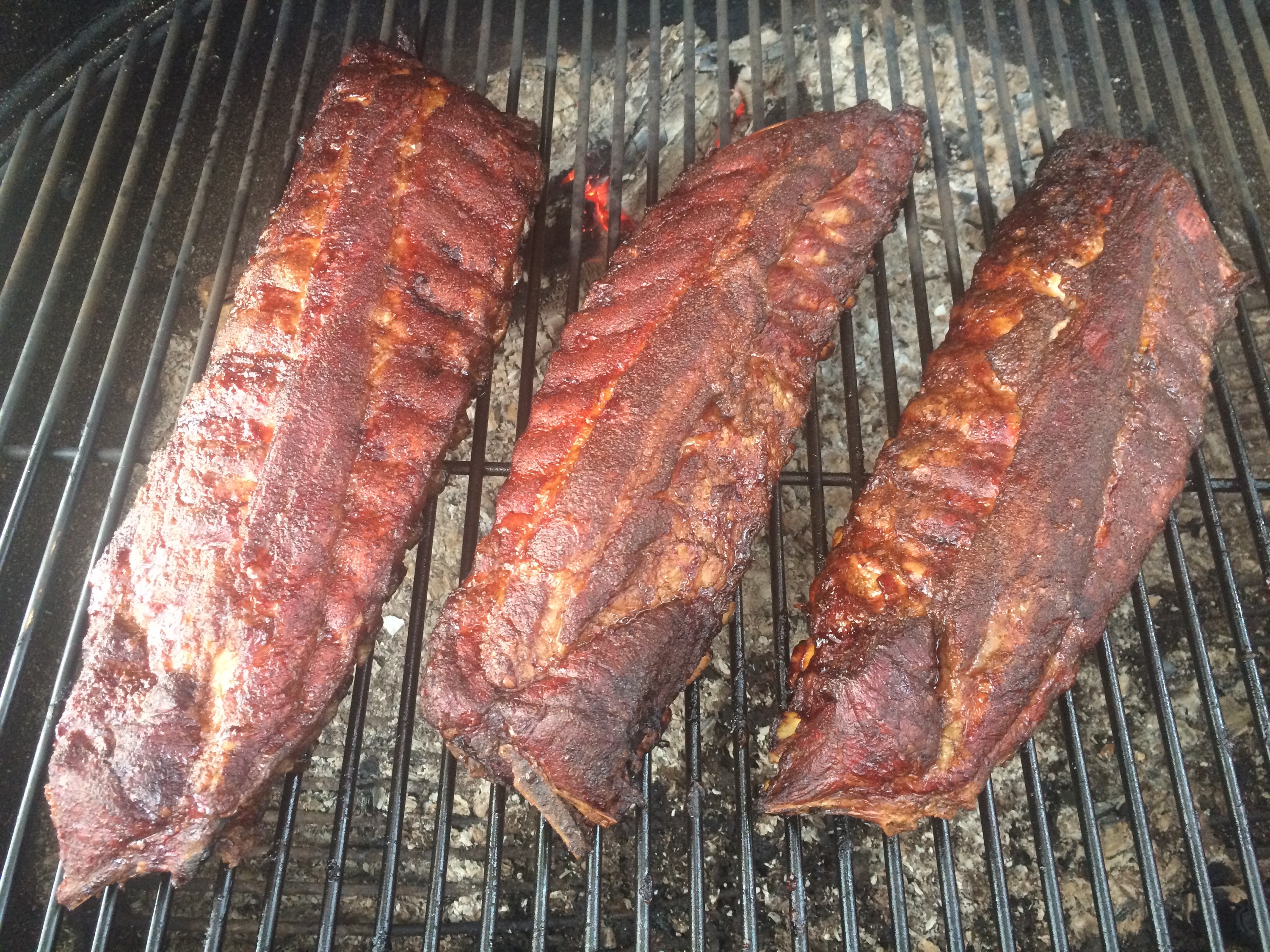 When the temperature is around 225-250 F, place your ribs on the side of the grill opposite the coals and close the lid, making sure the vents are open. Kick back and relax because the hard work is done. Enjoy a refreshing beverage and the smell of the hardwood smoke. Check every thirty minutes and add wood as necessary to maintain your temperature. After 3-4 hours the meat should have shrunk back a little, exposing the tips of the bones and the color should have darkened from a bright brick red to a deeper brown.