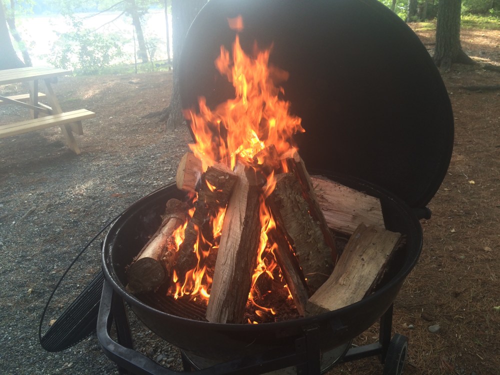 When the fire has burned down to coals, push it over to one side of the grill. You will be cooking the ribs on the other side using a method called indirect cooking. Using an oven thermometer, close the lid, making sure the vents are open and check the temperature of your grill. If it is above 250 F, let it burn down a little more. If it is below 200 F, build it up with a little more wood.