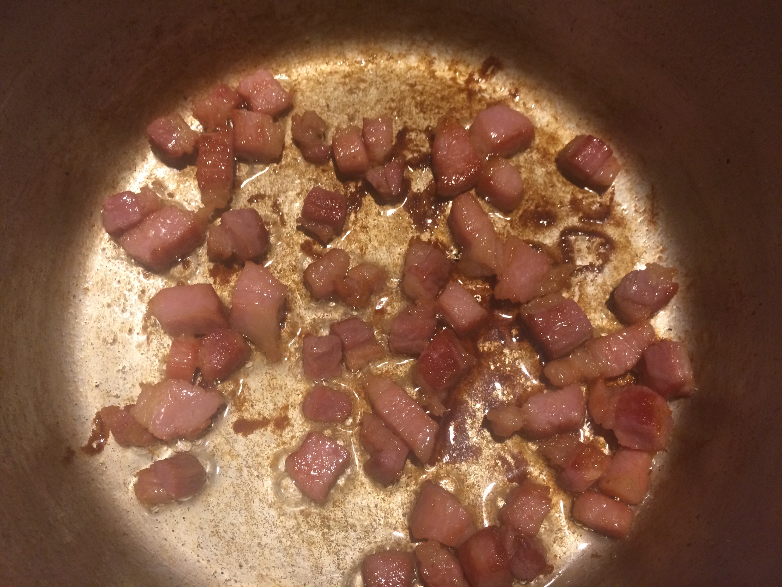 Heat a medium pot and add vegetable oil. Add salt pork and cook until the fat is rendered and pork is golden brown.