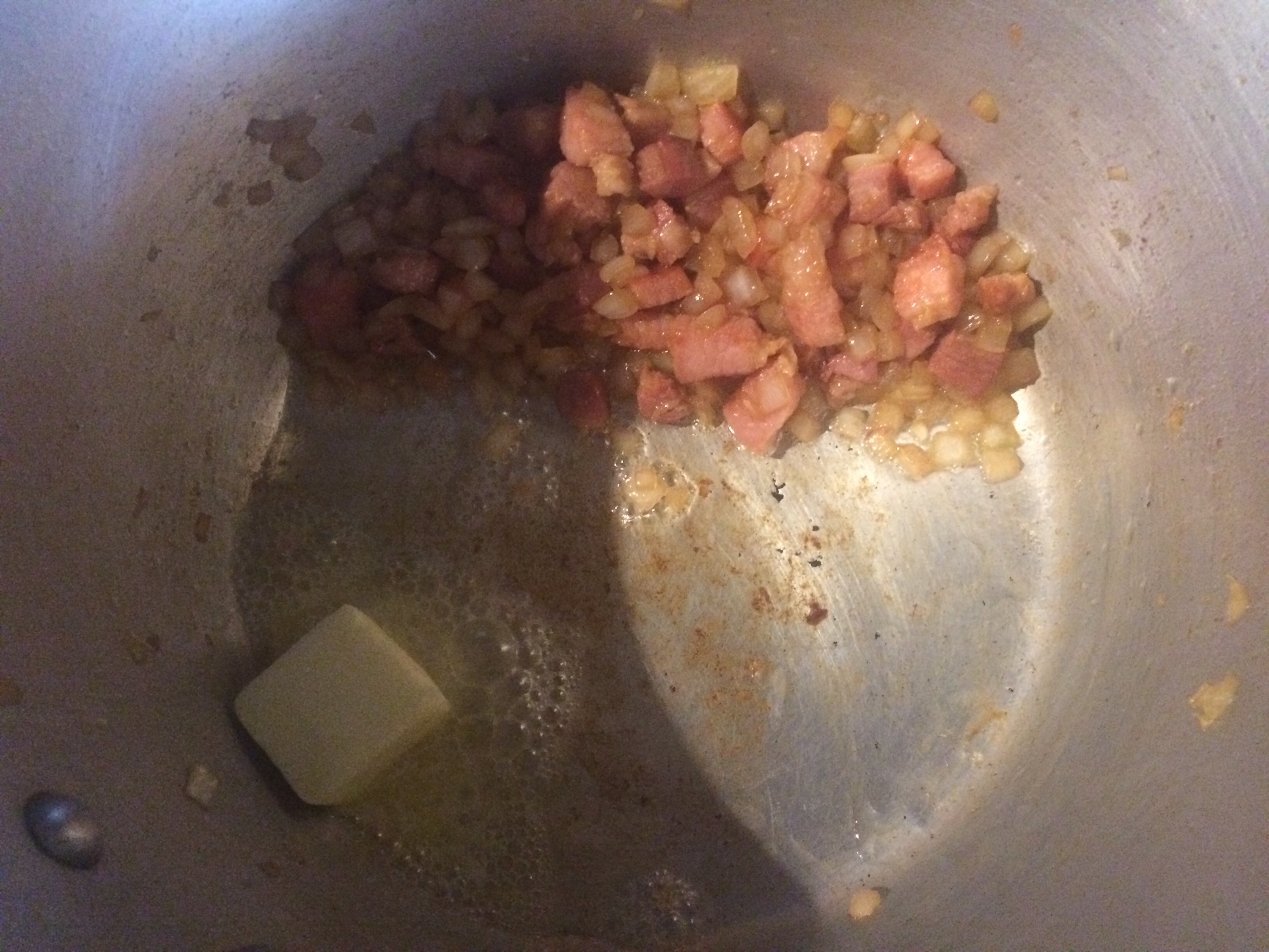 Add butter and allow to melt. I like to bring all the pork and onion to one side of the pot and let the fat collect on the other before I whisk in the flour, but it is not absolutely necessary.
