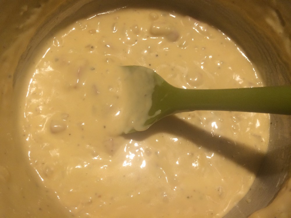 When the butter is completely melted, gradually add in your flour and whisk over medium heat to make a roux. When all the lumps are worked out and mixture starts to smell nutty, gradually add milk while whisking.