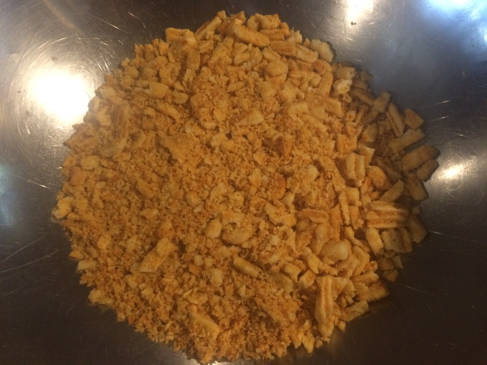 To prepare topping, crumble crackers into a bowl (I used John Wm. Macy’s Asiago and Cheddar Cheese Crisps but just about any cracker will do). Add melted butter and stir to combine.