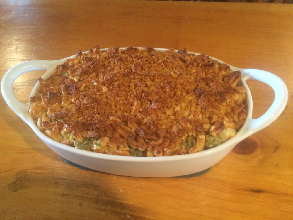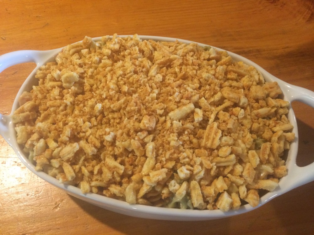 Place crackers on top of the casserole in an even layer and bake in the oven for 10 minutes or until golden brown and bubbly.