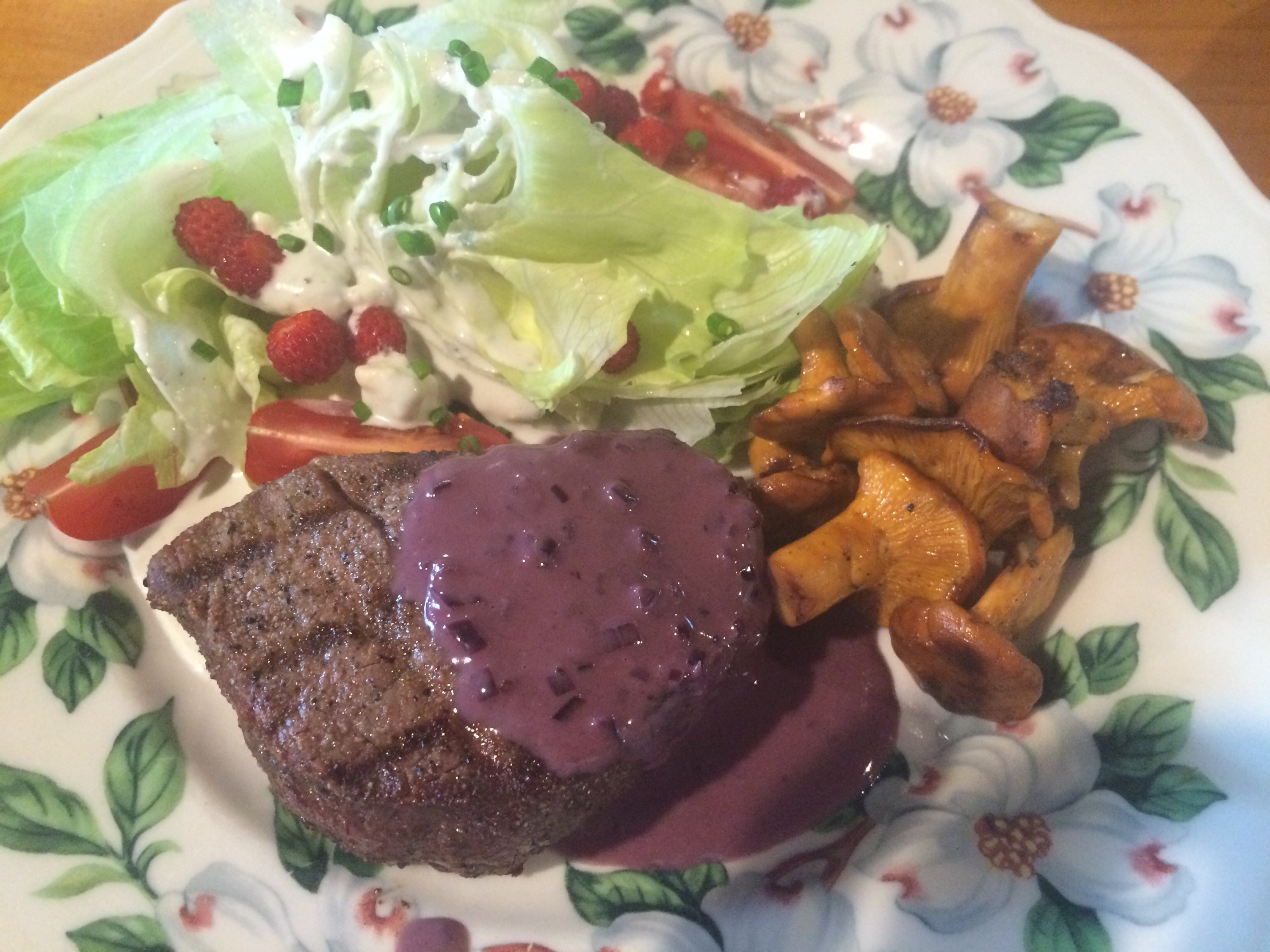 When the fire was ready, I grilled the steaks and the mushrooms together and then made a quick salad with blue cheese dressing, wild strawberries and chives. A red wine reduction mounted with a little cream and butter made a perfect sauce for the steak. My clients were thrilled with dinner but not as thrilled as I was with my afternoon adventure.