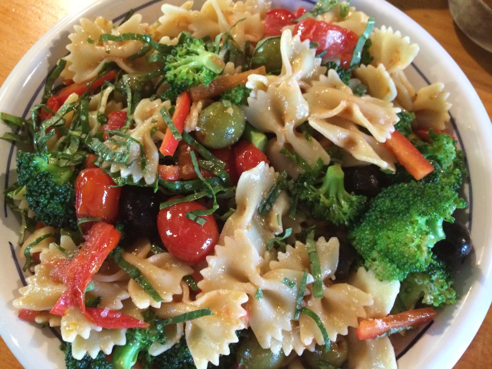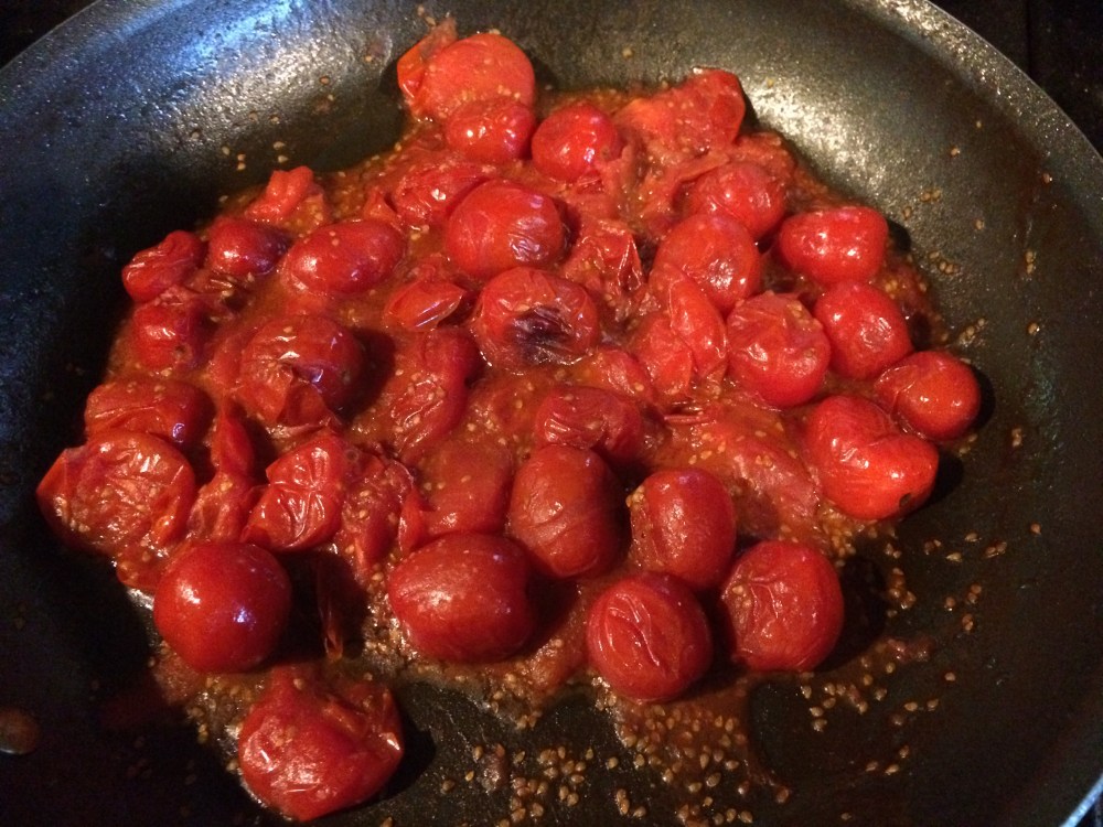 Cook tomatoes on medium high heat for 2-4 minutes, mashing half with a potato masher or spoon to release juices. When pasta is finished cooking, drain water and toss with tomatoes immediately. Cool to room temperature.