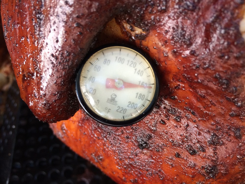 Check your chicken’s temperature by inserting a thermometer in the breast and along the thigh bone. Chicken is ready when the breast temperature measures 160 degrees and the thigh measures 175 degrees. If it isn’t ready, don’t rush it. Just close the lid, open another beer and cook a little longer.