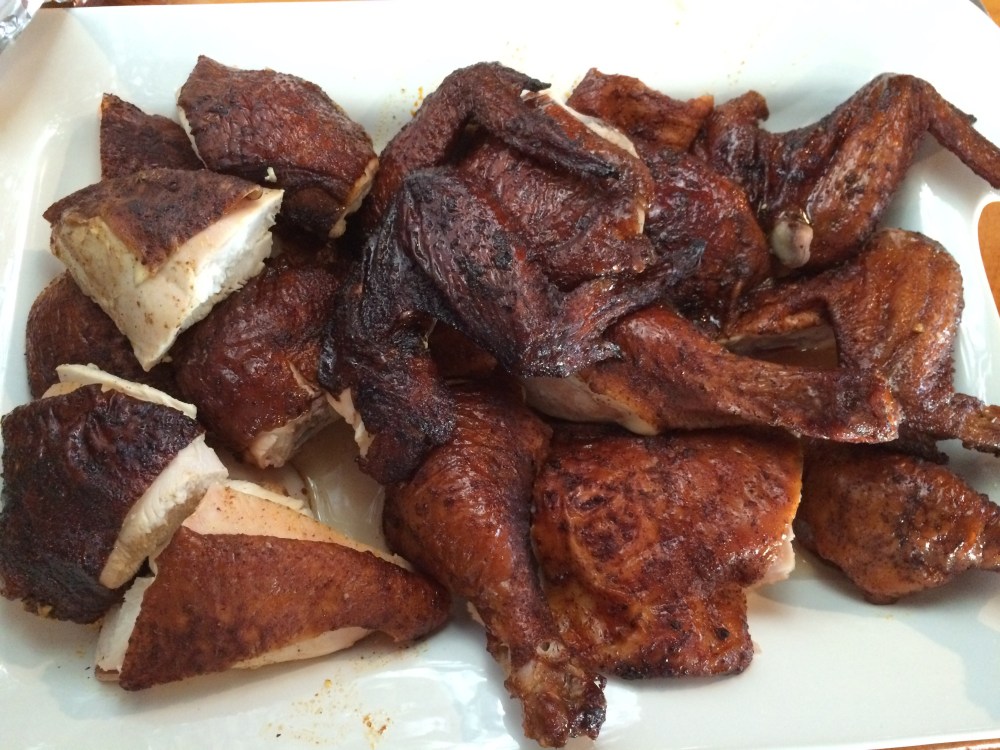 After the first hour, open the lid and take a look. Cooking over a live fire is not an exact science. There are many different variables that can affect cooking time. If all goes well, your chickens should look like this after an hour. A few times I have opened the grill only to be horrified at finding black, carbon-coated chickens inside. Every time I was pleasantly surprised to find that the chicken was still cooked perfectly inside and completely delicious!