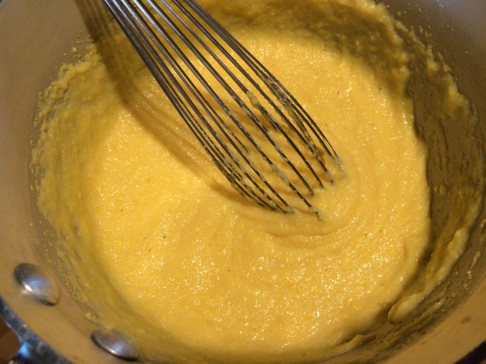 When ready to serve, add remaining ingredients and heat on medium low while stirring. You may need to add additional liquid to thin if it becomes too thick. You can use chicken stock, milk or water. Polenta should be the consistency of porridge. Taste and season with salt if necessary.