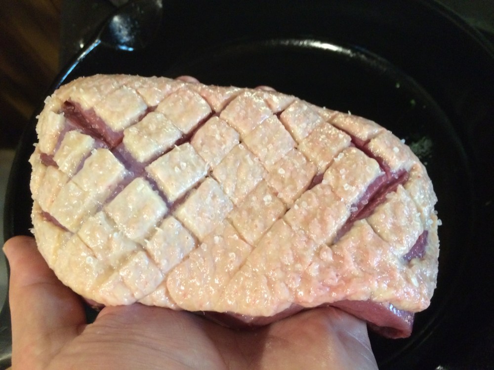 Heat a pan on the stove over medium heat and preheat the oven to 350 F. Using a very sharp knife, cut through the skin of the duck, first one way, then the other to make a diamond pattern. Be careful not to cut into the flesh.