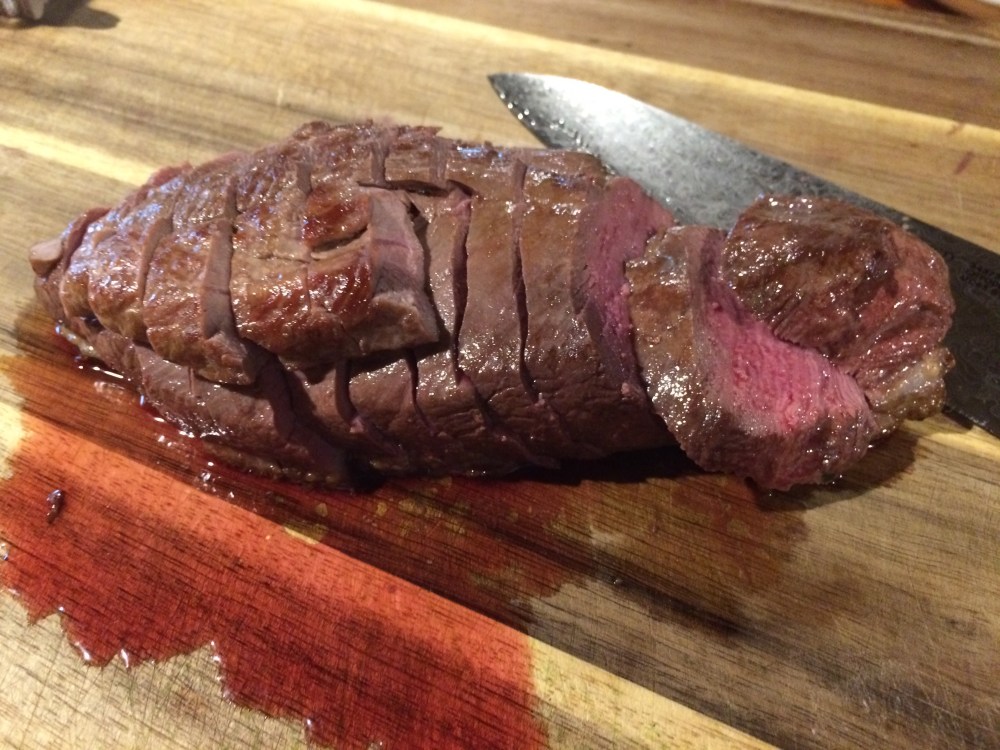 After the duck has rested, place it on a cutting board, skin side down and slice with a sharp knife.