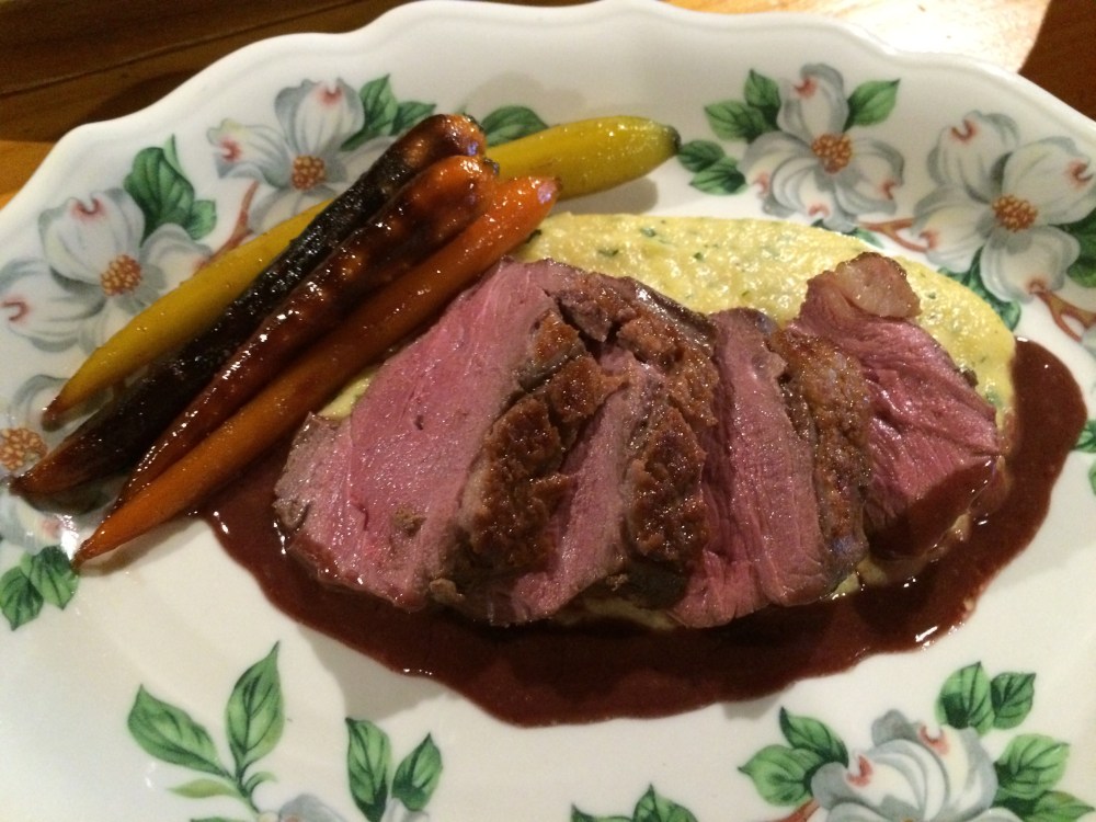 Dinner for two: Seared Duck Breast with Truffled Polenta, Maple Glazed Carrots and Cabernet-Red Currant Reduction