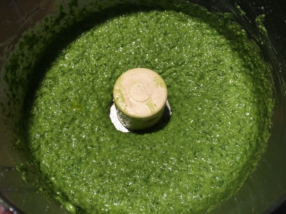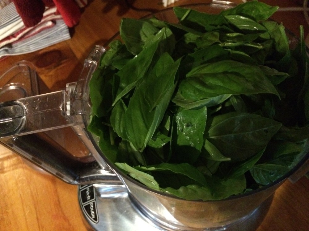 It was time to make pesto. This simple Italian sauce is the perfect way to take a large amount of fresh herbs and consolidate them into a small container that can be stored in the freezer until you are ready to use it.