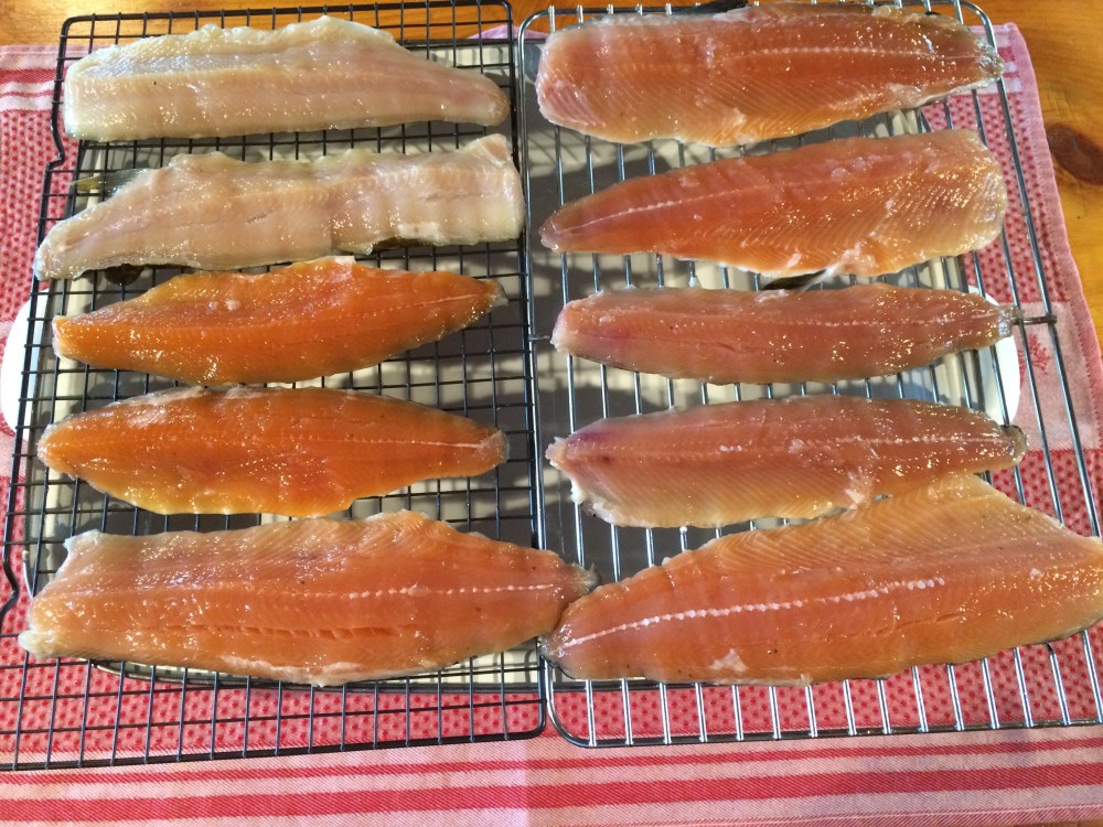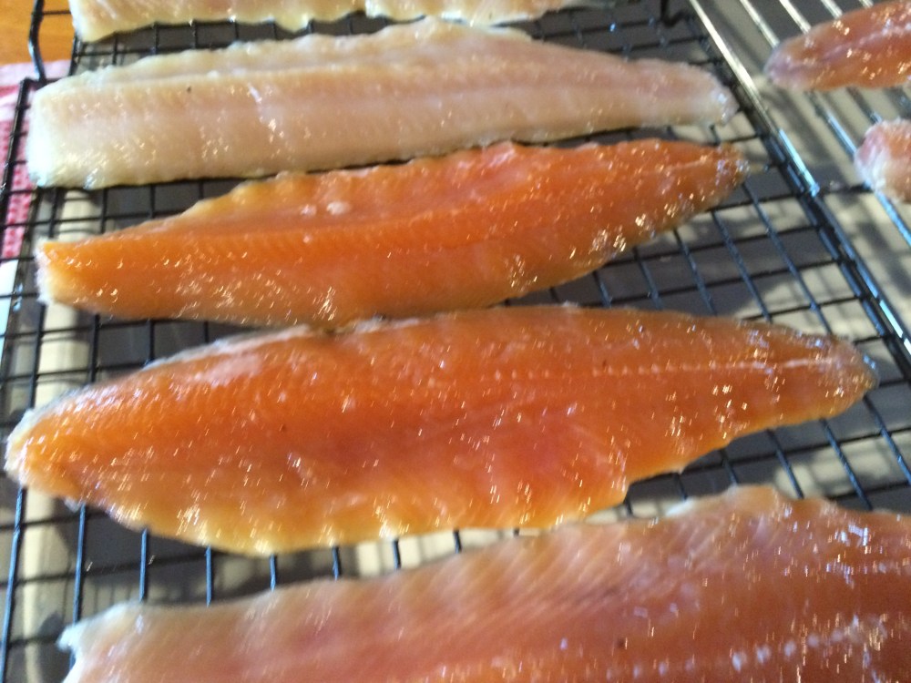 After an hour drying on the rack, the fillets should have a shiny appearance and feel tacky. They are now ready for the smoker.